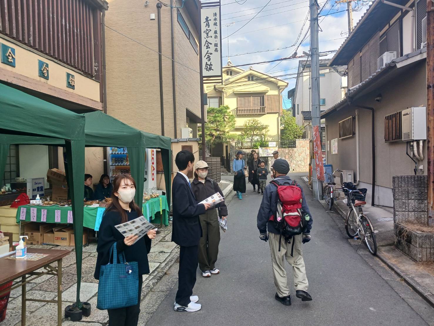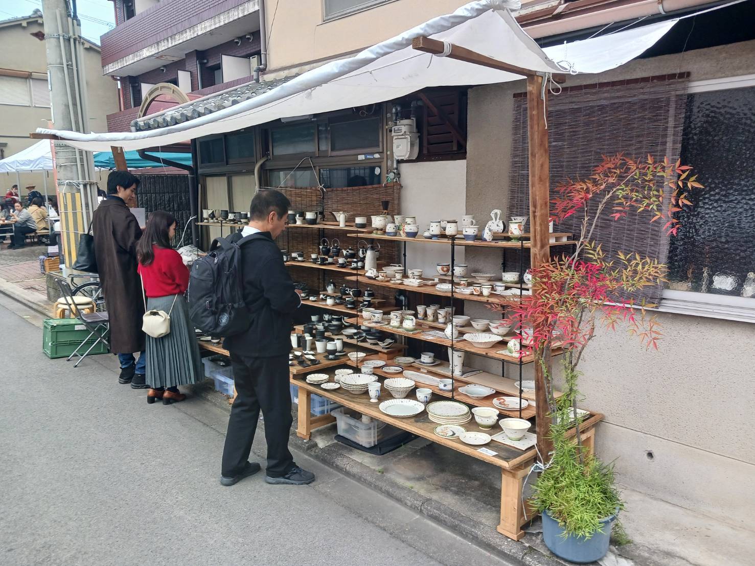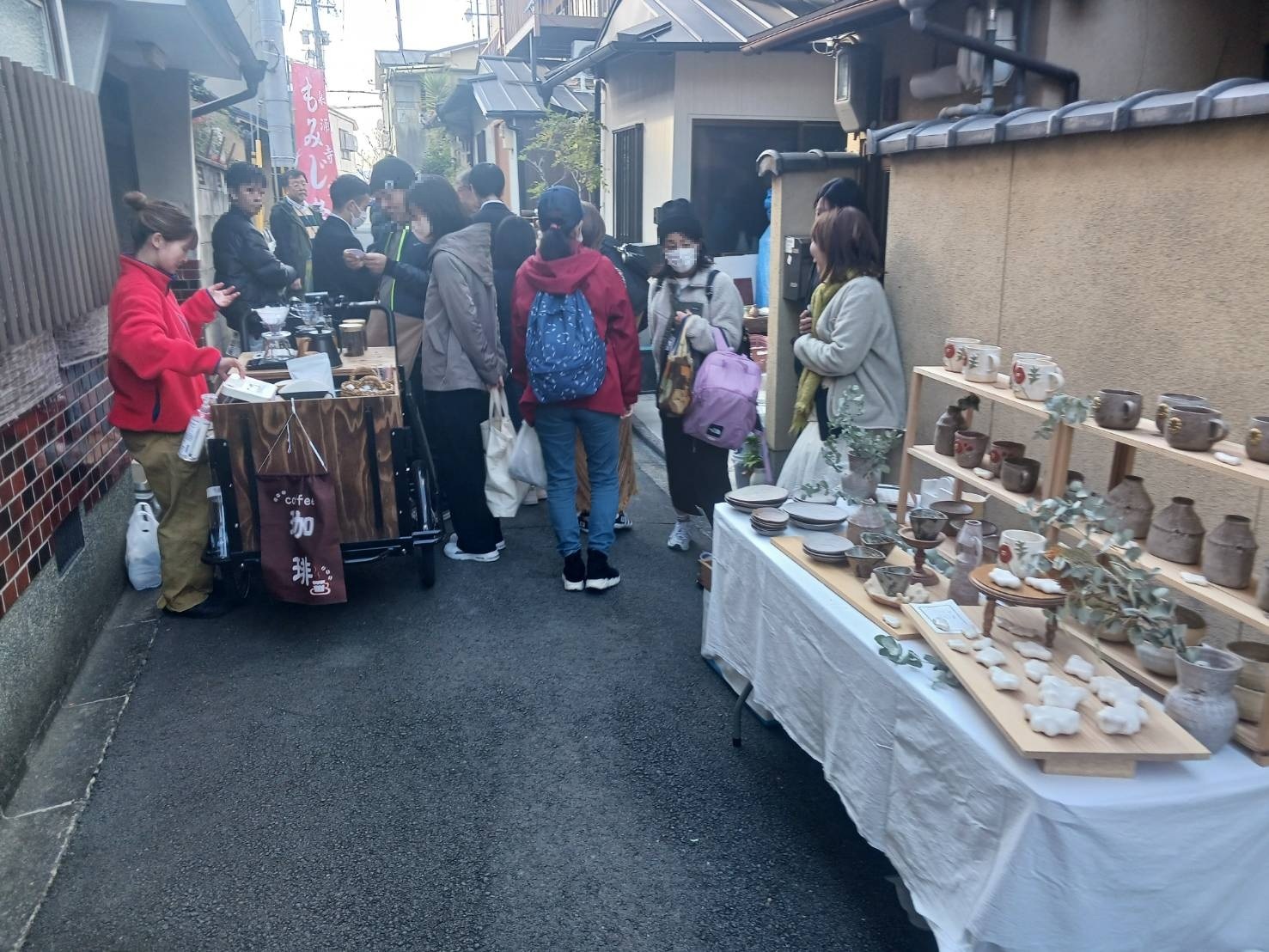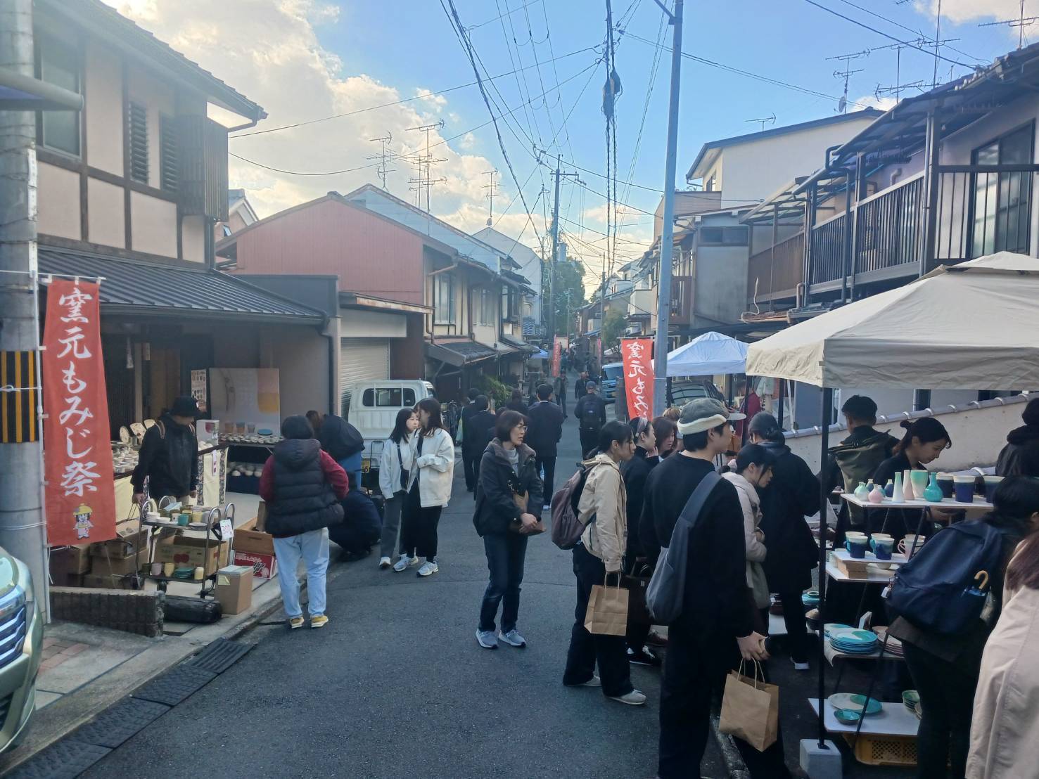 「京都青窯会協同組合」が紅葉シーズンとなる毎年11月末の週末に開催する年に一度の「窯元もみじまつり」は、地域の人たちも含めた多くの観光客を対象に伝統工芸である「京焼・清水焼」の窯元を紹介し、作家の顔が見える環境で陶器が販売され、多くの来場者でにぎわいました。当日はキッチンカー等のグルメブースや休憩スペースもあり、ゆっくり陶器と触れ合えるおまつりでした。紅葉シーズンでもあり、近隣の泉涌寺や東福寺の観光客の方にも足を運んでもらい、東山区南部地域で回遊性のあるもみじまつりとなりました。