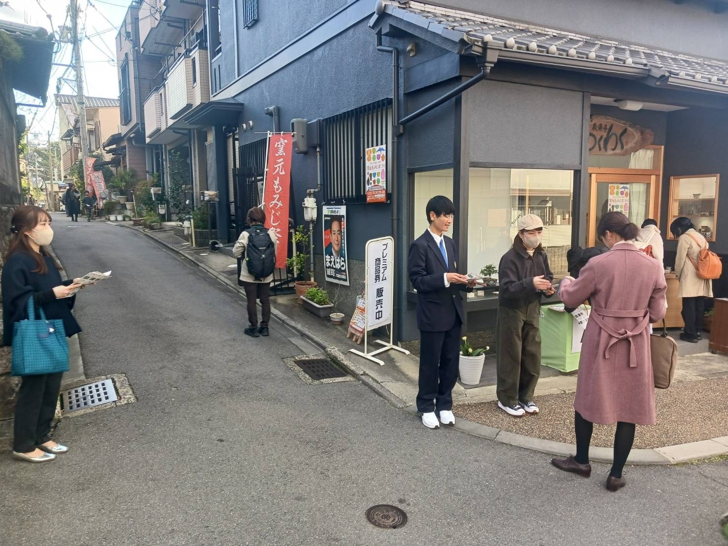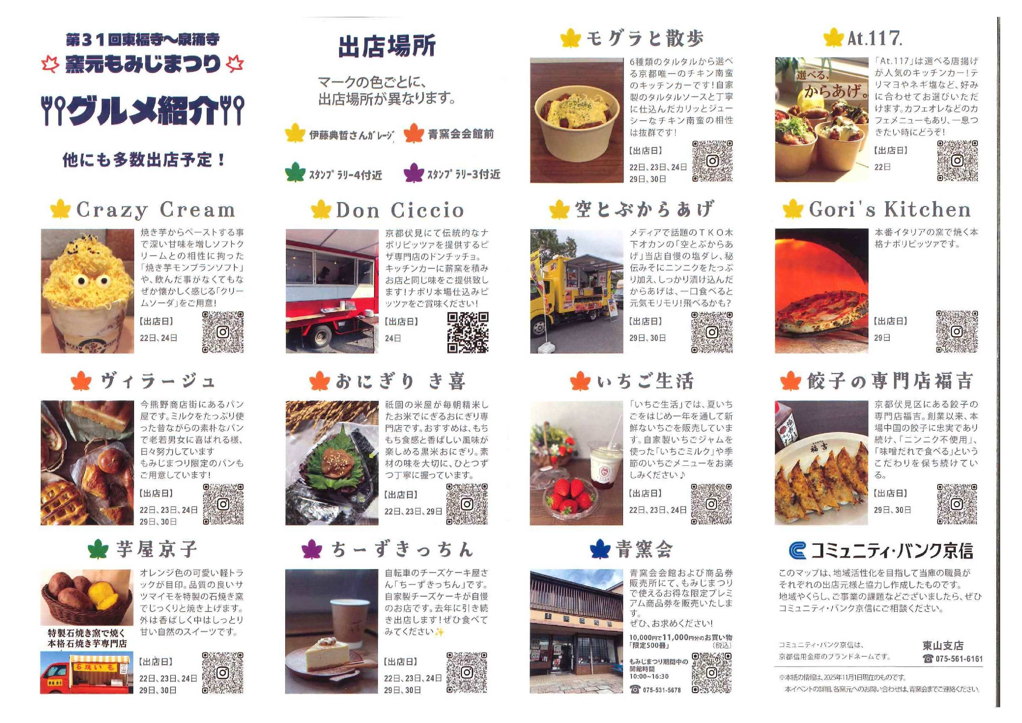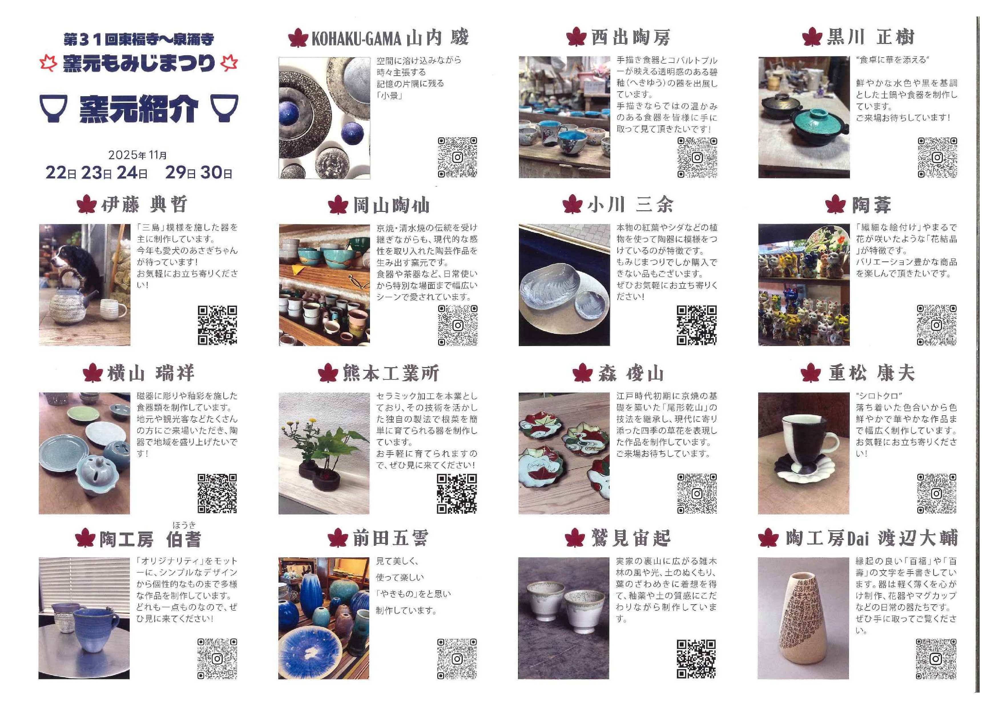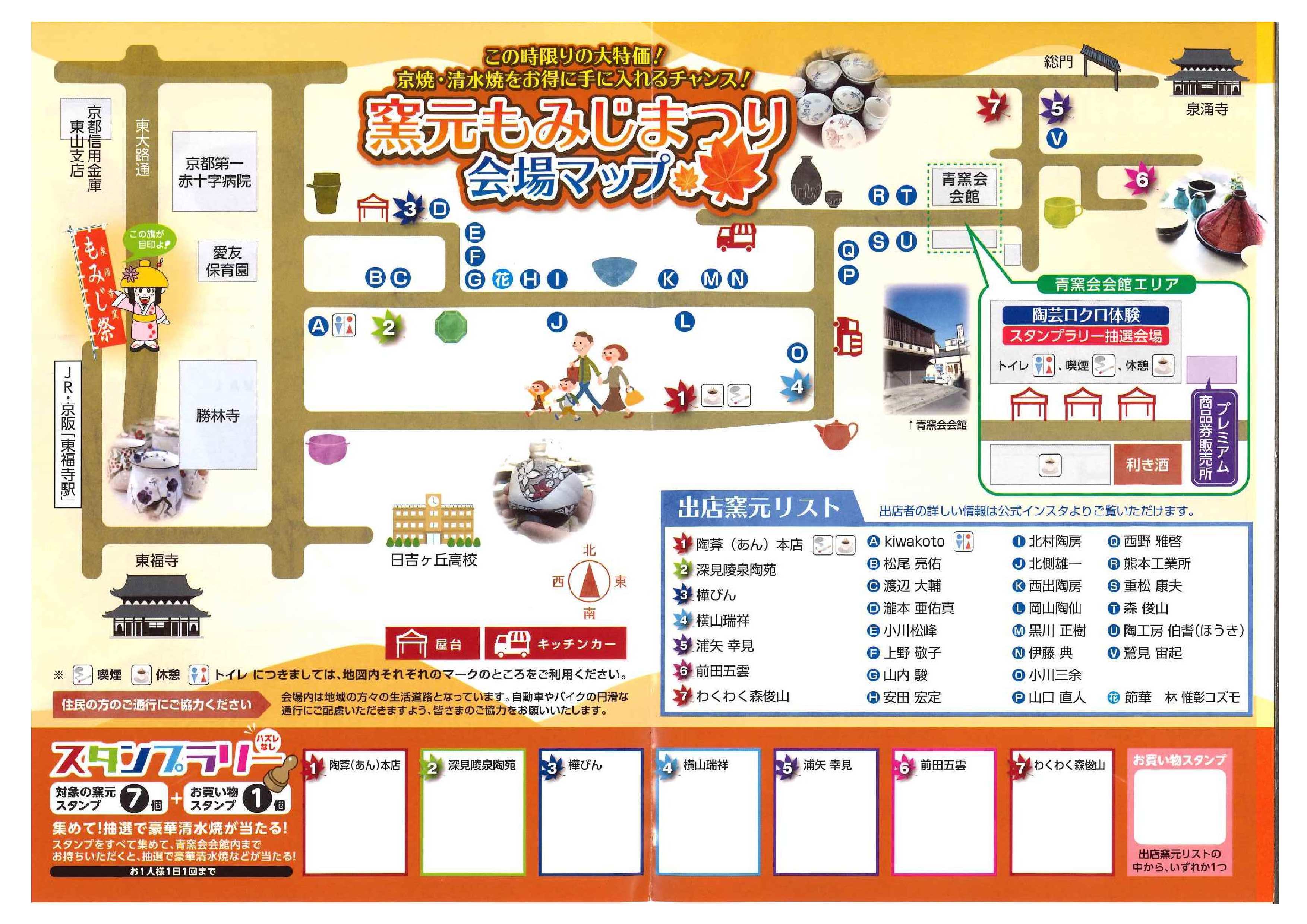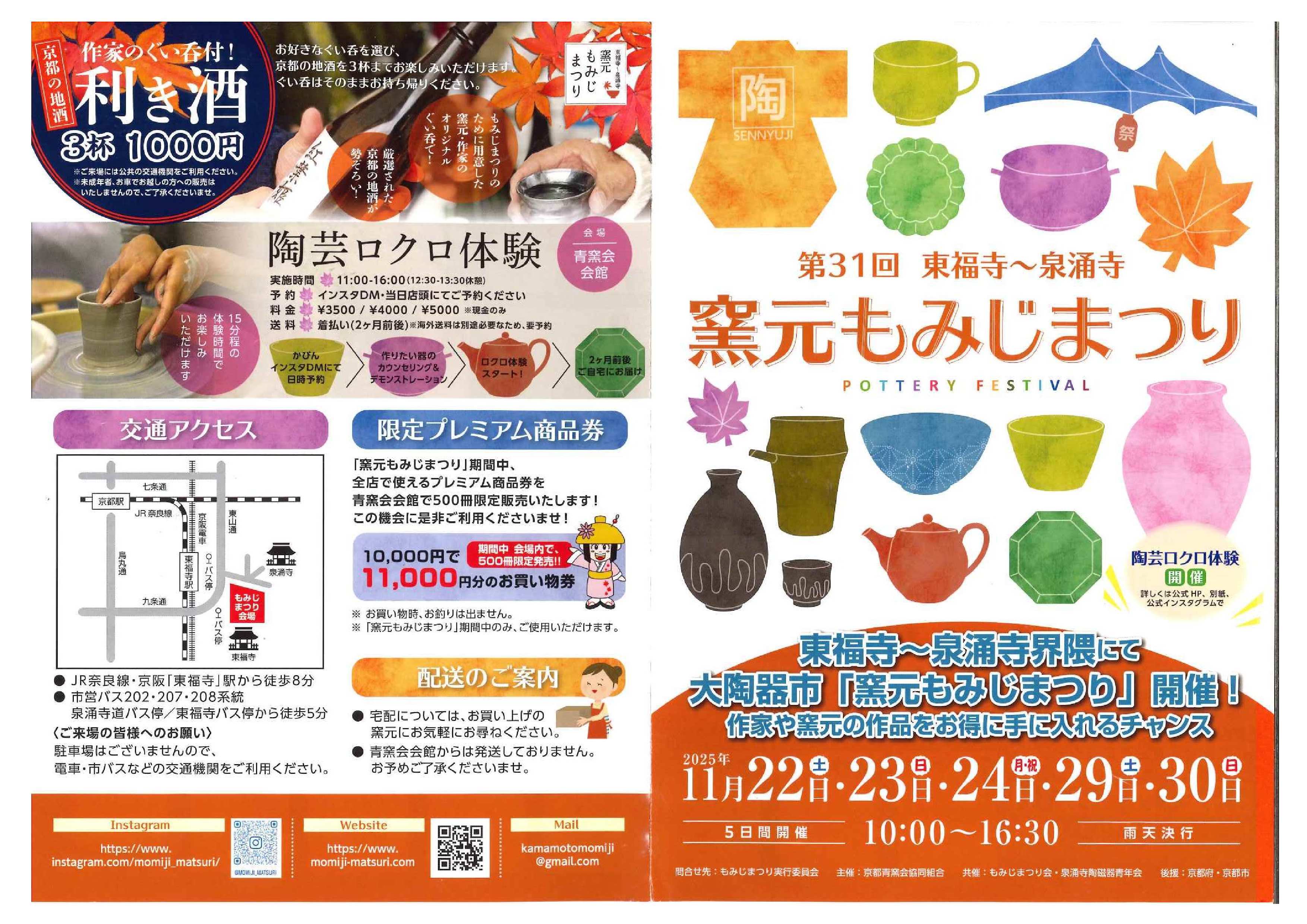 「京都青窯会協同組合」が紅葉シーズンとなる毎年11月末の週末に開催する年に一度の「窯元もみじまつり」は、地域の人たちも含めた多くの観光客を対象に伝統工芸である「京焼・清水焼」の窯元を紹介し、作家の顔が見える環境で陶器が販売され、多くの来場者でにぎわいました。当日はキッチンカー等のグルメブースや休憩スペースもあり、ゆっくり陶器と触れ合えるおまつりでした。紅葉シーズンでもあり、近隣の泉涌寺や東福寺の観光客の方にも足を運んでもらい、東山区南部地域で回遊性のあるもみじまつりとなりました。