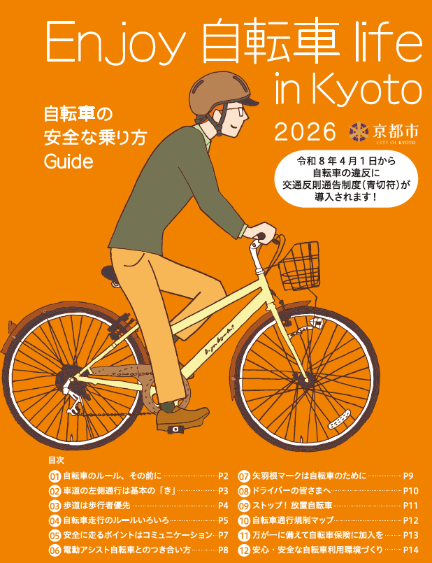報道発表資料(PDF形式, 455.09KB)自転車の基本的なルール等をまとめた冊子「Enjoy 自転車 life in Kyoto」2026年版を発行します。