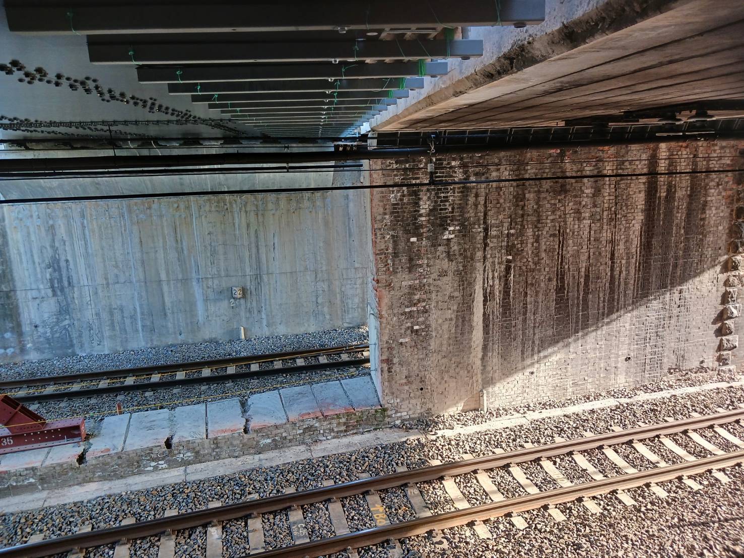 橋の下の写真で新しい橋桁の下は橋脚が無くなりました(写真の左側)(令和7年4月)