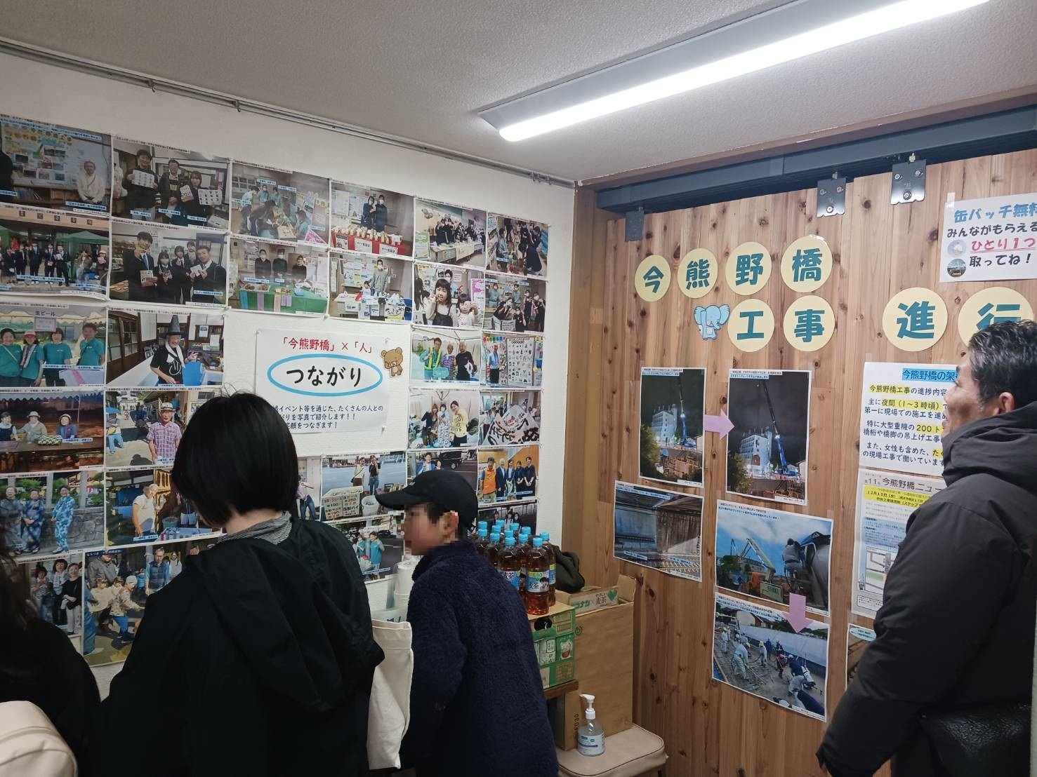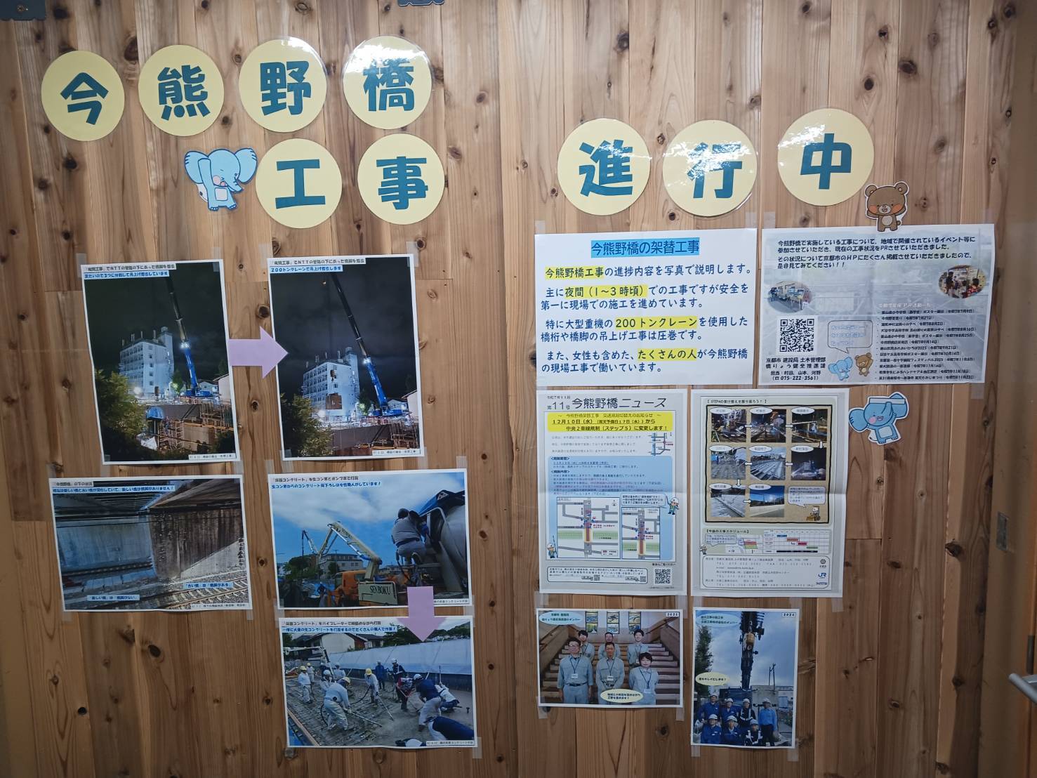 現在の工事状況がJR列車の運行終了後の夜間施工が中心であることから、昼間は工事の進捗が分かりにくいため、夜間施工の状況や工事現場の雰囲気が伝わるように工事写真を掲示しました。特に撤去された橋脚の状況や床版コンクリートの打設状況等を写真でわかりやすく伝えました。また、今年の地域イベントへ参加した際の地域の方との交流状況の写真を掲示し、「今熊野橋」×「人」をテーマにした「つながり」を紹介させていただきました。