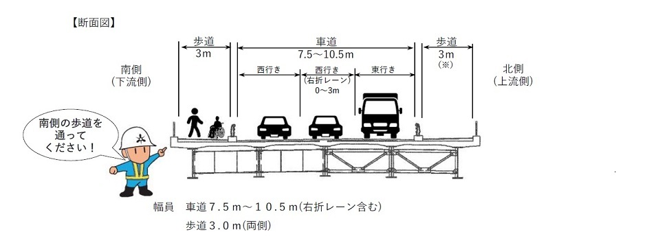 ・既設区間の北側の歩道が完成するまでは、延伸区間につきましても、南側のみを通行していただきますようお願いします。