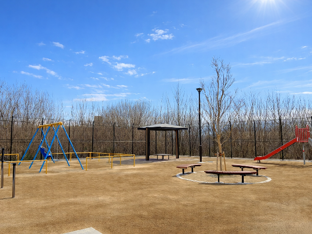 地域の皆様と意見交換を行うワークショップを踏まえて取りまとめられた公園の整備計画に基づき、遊具や休憩施設を配置しました。また、公園の中央にはシンボルツリーとして夏から初秋にかけて開花時期を迎える「サルスベリ」を植栽し、その周囲に公園利用者が集えるサークルベンチを設けました。