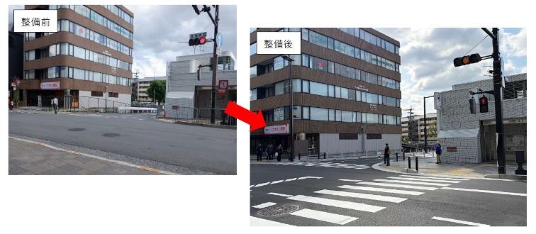 大和大路本町通において三条通との交差点付近は、車道が屈曲していて、また、東側歩道が整備されていない状況でした。