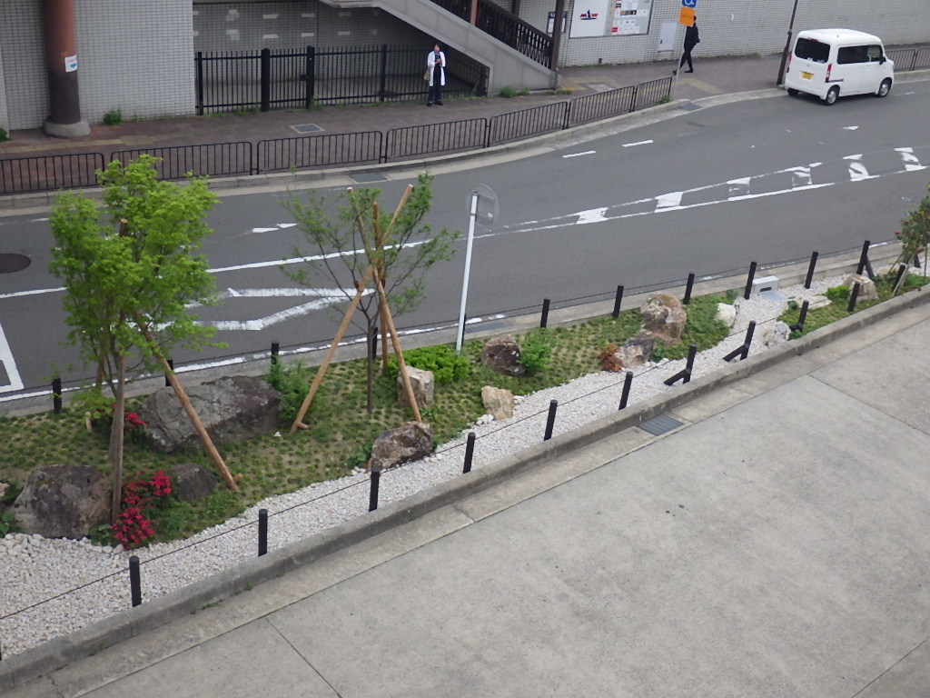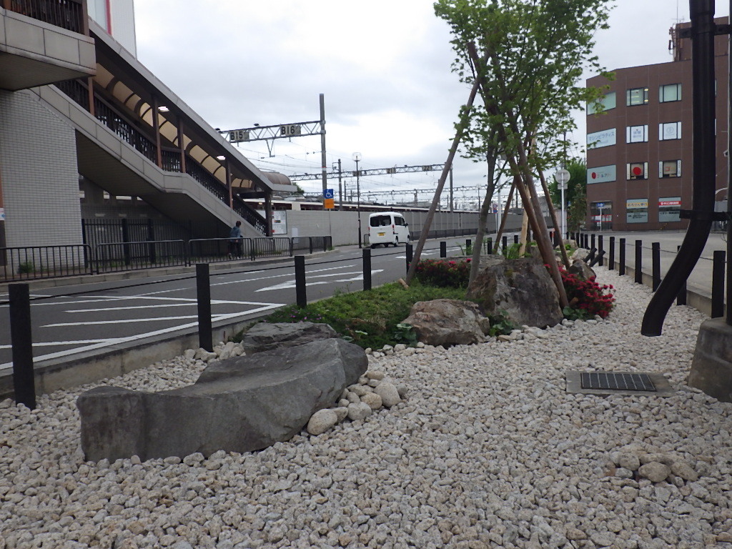 ・駅前に、地域のシンボルとなるような州浜や景石、高木、低木や地被類を配置した、庭園風の雨庭を整備