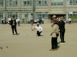 葛野小学校の校庭では,ペタンクが行われました。この競技は,目標の小さな玉に向けて,鉄製のボールを投げて,いかに近づけるかを2チームで競うもので,トリノオリンピックで人気のカーリングの陸上版というところでしょうか。女性も多く参加されており,生涯スポーツとして人気があるニュースポーツです。
