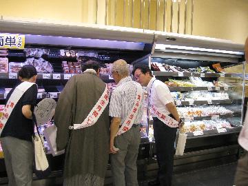北大路ビブレ内のスーパーでは,お買い物を楽しまれている区民の皆さんに,食中毒予防の啓発用うちわを手渡しし,夏場の食中毒に注意していただくよう声をかけるとともに,店内の食品従事者の方に食品の衛生的な取扱いなどについて指導をしました。続いて,北大路烏丸周辺で飲食店への立入調査にも同行しました。