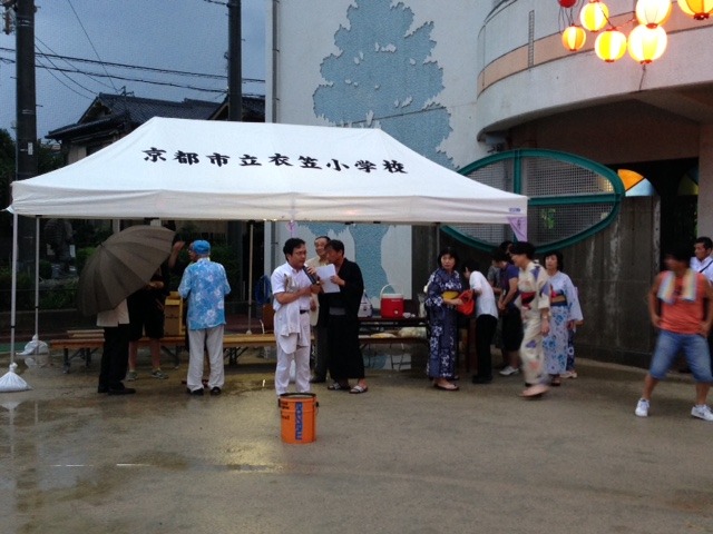 衣笠小学校に着いた6時過ぎには雨も上がり,「第7回衣笠夏まつり」は無事に開催されました。その陰には,グラウンドの雨水をスポンジで吸い取ってまつり会場を整備してくださった地域の方々の姿がありました。
