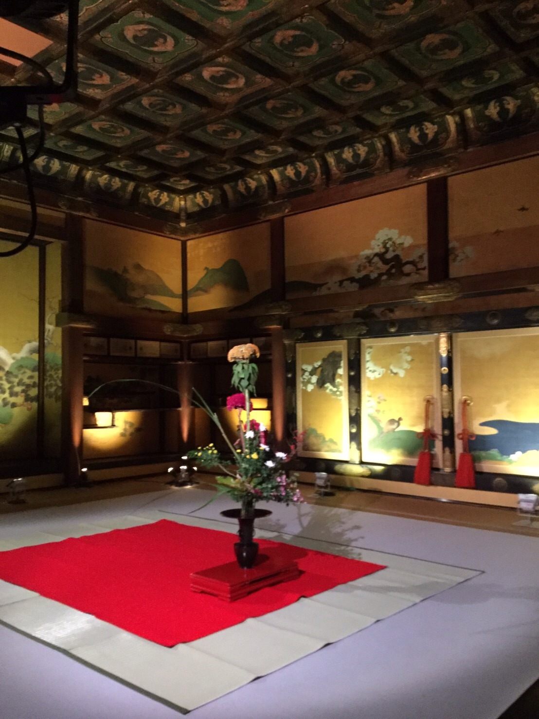 ほのかな明かりが灯された夜の御殿の中には,当時の衣装をまとった案内人と,能装束,茶道具などの展示があり,また,障壁画がライトアップされて,より鮮明に浮かびあがり幻想的な雰囲気でした。中でも,北区未来につながる区民会議顧問を務めていただいている華道家元池坊次期家元池坊専好氏による立花の凛とした様子は圧巻でした。