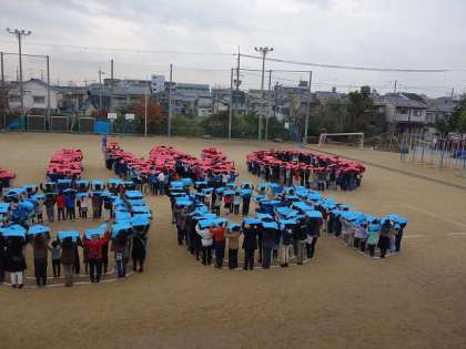 11月30日(木曜日),大宮小学校創立100周年PTA記念事業「人文字航空写真撮影」が同校のグラウンドで開催されました。当初は先日行われた「バルーンリリース」と同時開催の予定でしたが,あいにくの曇り空で飛行機が飛ばず,延期となっていました。