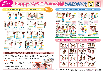 すごろくは,北区を反時計周りに観光しながら一周するストーリーで,北区の魅力を改めて感じて頂ける内容になっているほか,実際に体操を行う健康運動マスを設定し,健康づくりにも役立てていただけます。また,裏面には,北区オリジナル健康体操「Happy☆キタエちゃん体操」も掲載しています。