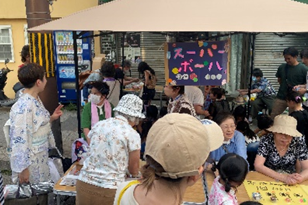 続いて、こちらも4年ぶりの開催となる「北区新大宮夏まつり」が新大宮商店街で開催され、商店街は、先が見えないほどのお客さんで賑わっており、まさに商店街と地域が一体となったお祭りでした。車両通行止の大宮通を囲むように、待鳳学区や鳳徳学区などの各種団体の皆様や商店街の皆様によるブースが数多く出展されていました。どのブースも長い行列ができており、地域の皆様が夏まつりを楽しみにしてこられたことが窺えました。