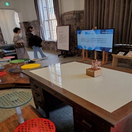 カラフルで色々な高さの丸椅子で、大柄な人、小柄な人、荷物を持っている人、子供、高齢者、など、それぞれが自分にあった丸椅子に座れる空間が演出されていました。