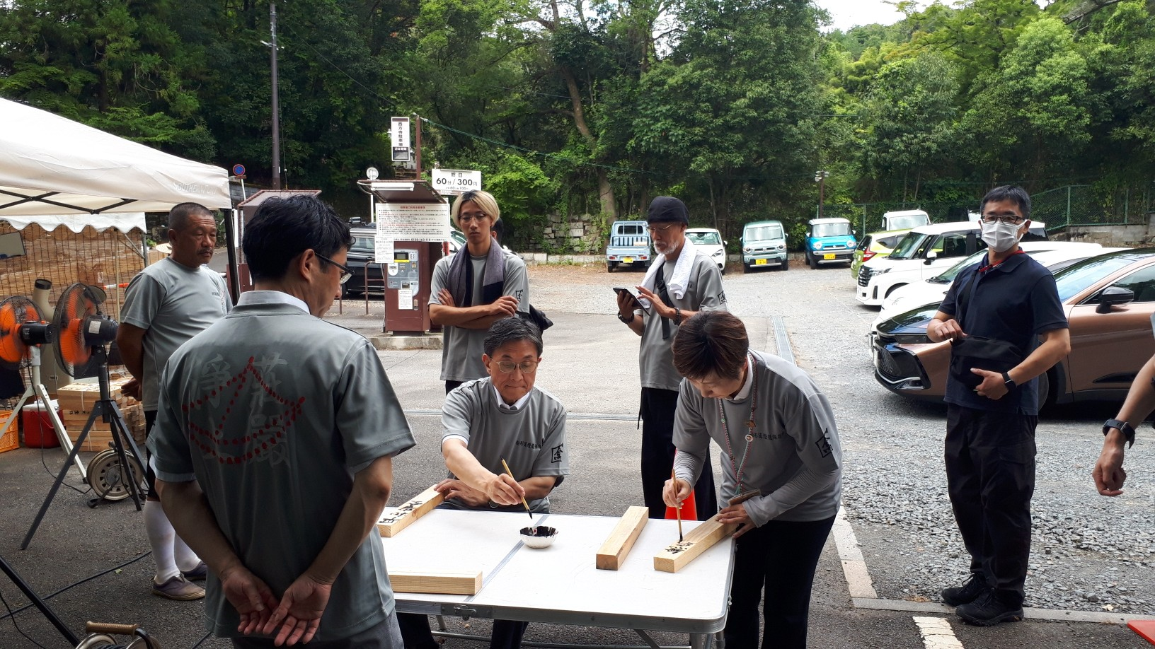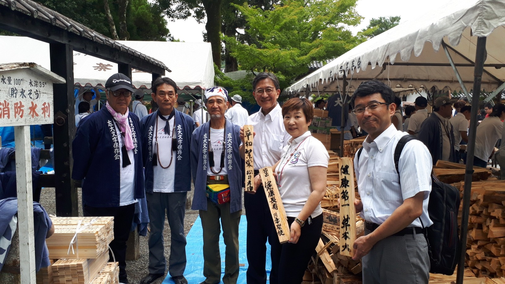 当日は護摩木の奉納にたくさんの方がお越しになられており、私も護摩木を奉納させていただきました。また、船形では、保存会の皆様や松井市長と山上に上がって、火床の見学もさせていただきました。