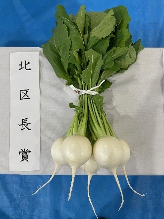 今年の品評会では、北区長賞としては「中カブ」を選ばせていただきましたが、他にも白菜や大根といった様々な野菜が各賞に選ばれました。受賞者の皆様、おめでとうございます。