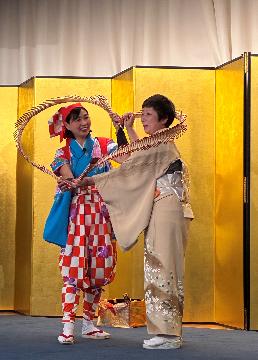 途中のアトラクションでは、福呼ぶ玉すだれ「福果会」代表の中村 美果さんにより、日本の伝統的な大道芸である傘回しと玉すだれが披露されました。私と横山会長も飛び入り参加し、中村さんと一緒に玉すだれを披露させていただき、楽しいひと時を過ごさせていただきました。