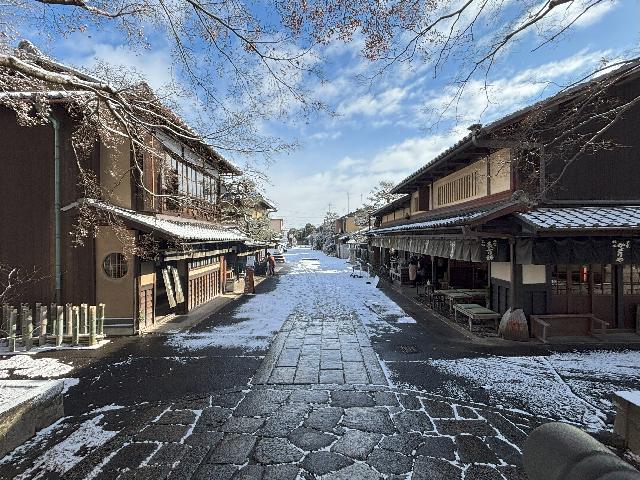 雪の降った朝に今宮神社の参道にあるあぶり餅の一文字屋和輔とあぶり餅本家根元かざりやさんの開店前のまだ人の気配が無い風景を撮りました。