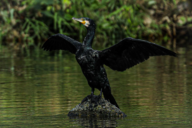 これは川鵜でしょうか。濡れた羽を乾かしているこの独特なポーズは、とても迫力があります。鳥の目や、濡れた羽の質感がとてもシャープに写っていて、生き生きとした生命力を感じます。背景の緑がきれいにぼけているので、鳥の姿がくっきりと浮かび上がっているのも良いですね。被写体をしっかりと観察していろいろな生き物の「決定的瞬間」を狙ってみてください。