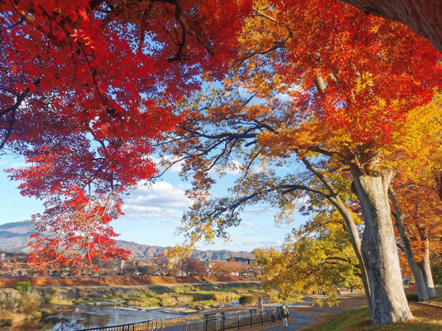 目が覚めるような鮮やかさで、赤や黄色の紅葉と、青い空の組み合わせが本当にきれいです。右側の大きな木と、頭上を覆う枝が、額縁のように奥の景色を囲んでいます。そのおかげで、奥に見える川や山の景色がより引き立って見えます。 下の方を歩いている人を小さく入れたので、風景のスケール感がよく伝わってきます。