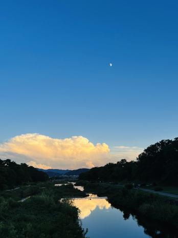 学校の帰り道での夏の終わり頃の鴨川と月。