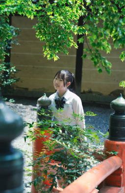 とっても爽やかで季節感があるすてきなポートレートですね。モデルさんのふとした瞬間の優しい表情も、自然に捉えられていて素晴らしいです。手前の朱色の柵や画面周辺の鮮やかな青もみじがモデルさんを引き立っています。