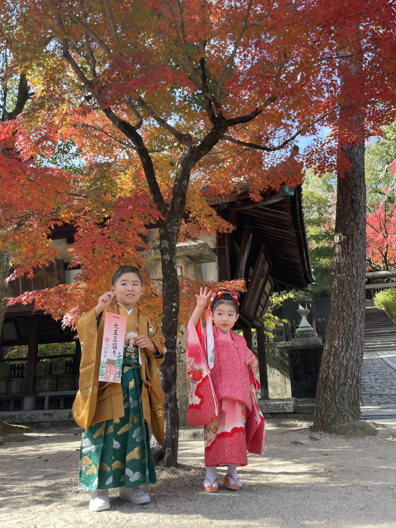 真っ赤な紅葉が屋根のように2人を包み込んでいるような温かさを感じます。女の子の赤い着物と紅葉の赤、男の子の緑の袴と背景の松の木の緑、この色の組み合わせがとても鮮やかで、写真全体がカラフルで楽しい雰囲気になっています。