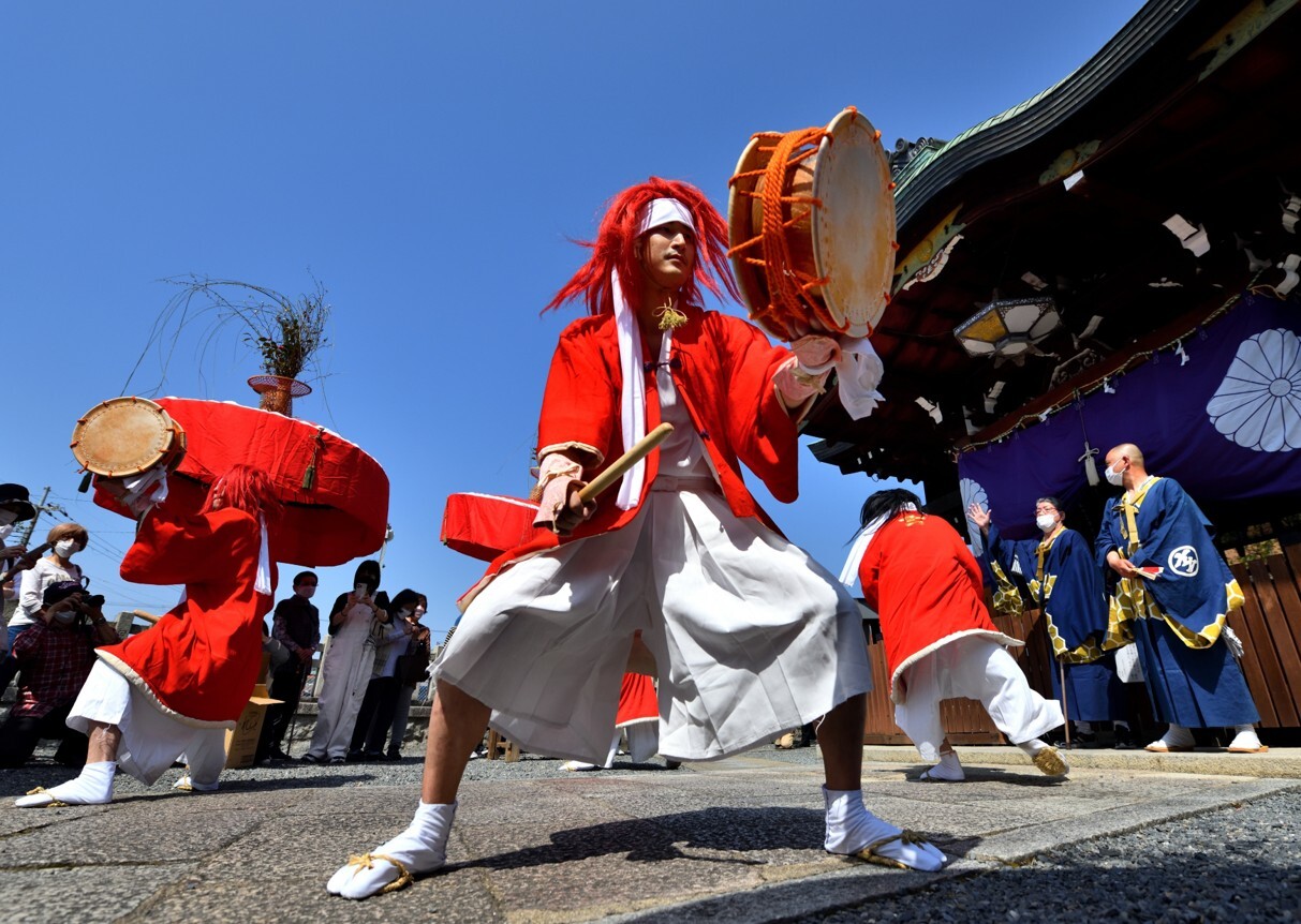 青空のブルーと衣装の鮮やかな赤、そして袴の白の対比が非常に美しい写真です。低い位置から見上げるようなアングルで演者の大きく開いた足の構えや、天に向かって伸びるような姿勢が強調され、演者のダイナミックな動きをさらに引き立てています。力強く、躍動感に溢れた素晴らしい作品です。