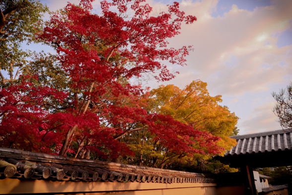 築地塀の重厚な水平ラインと、空に向かって広がる燃えるような赤色のモミジの対比が美しい作品です。斜めから差し込んでくる夕陽が木々の立体感を強調し、夕暮れ時の赤みがかった雲の色がノスタルジックな古都の秋の風情を醸し出しています。非常に素直で好感の持てる作品です。