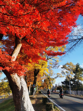 目が覚めるような紅葉の赤と、空の青のコントラストが素晴らしい作品です。手前の力強い木の幹から、奥へと続く道路のパースペクティブもしっかりと表現されており、見る人の視線を自然と写真の奥へと誘導する力があります。季節の美しさを素直に切り取った、気持ちの良い写真です。