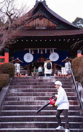 奥には拝殿に向かって手を合わせて静かに祈る参拝者人々の「非日常」があり、手前には赤いブロワー送風機を持って階段掃除する人物の「日常」があります。このコントラストが、「美しい景色は誰かの仕事によって守られている」という物語を感じさせます。