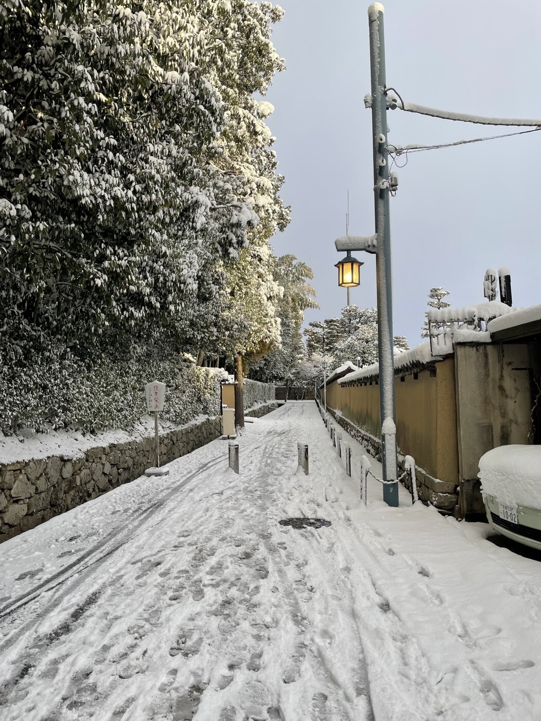 一昨年、京都市内に久しぶりに雪が降った日を切り取った1枚です。毎日の様に見ていた景色が雪により新しい景色に変わり驚いたので応募しました。木々の葉が落ちているところがあり冬を感じさせる写真になったかなと思います。
