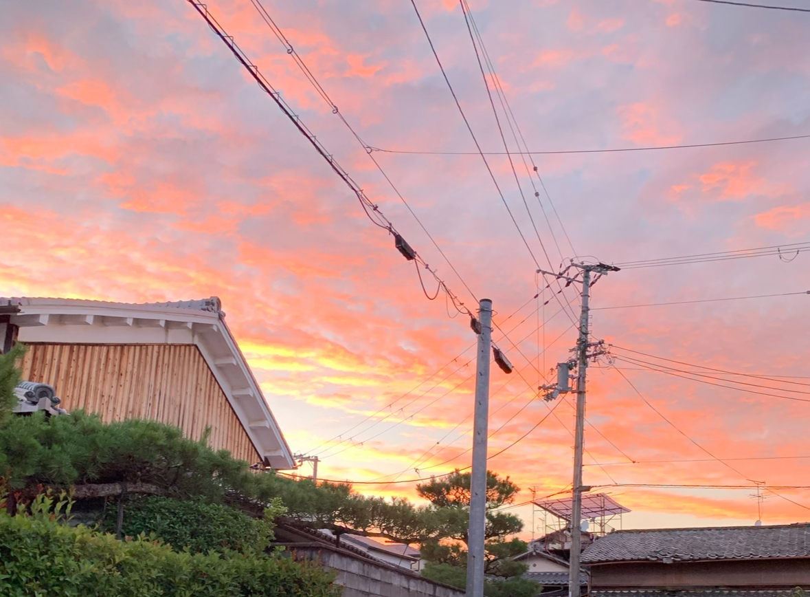 息をのむような美しい夕焼けのグラデーションが素晴らしいです。ピンク、オレンジ、そして薄い水色が混ざり合う空の色は、見ているだけで感動します。日常の風景の中にある「魔法のような瞬間」を敏感に感じ取られたようです。写真では電線や電柱は邪魔なものとして避けられがちですが、この場合、あえてそれらを大きく入れることで、夕暮れ時の「生活感」や「哀愁」が表現されています。