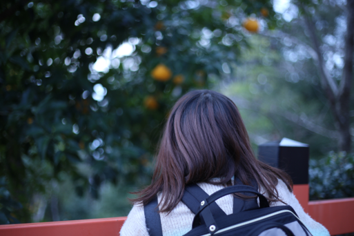 背景の木々や果実(ゆず)を、優しいボケ味で表現することで、幻想的な雰囲気を演出しています。これによって、手前の人物の髪の質感や赤い欄干の存在感が際立っています。欄干の「朱色」と背景の「緑」、そしてゆずの「黄色」という配色は、日本の伝統的な色彩感覚を感じさせ、撮影場所の静けさが伝わってきます。