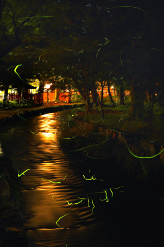 境内を流れる御手洗川で沢山の蛍が発光しながら飛び交う幻想的な景色はおとぎ話のようでした。
