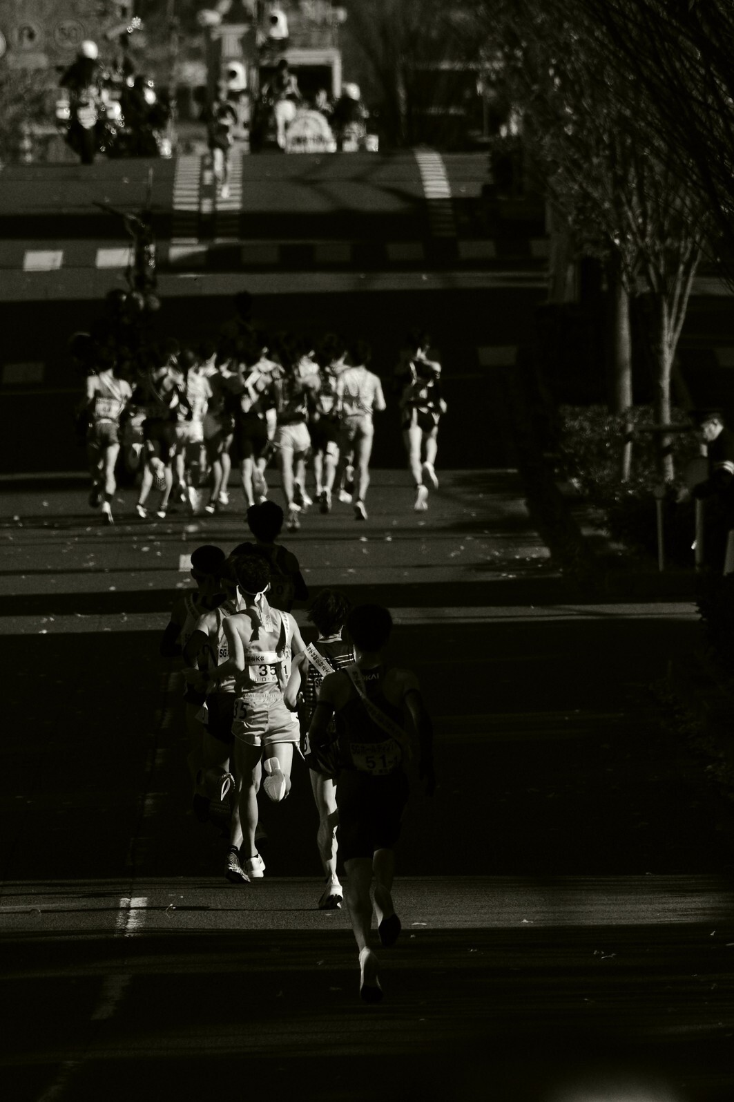 あえて色彩を排除したことで、ランナーたちの筋肉の動き、汗の質感、そして光と影のコントラストが極限まで強調されて、選手たちの内面にあるストイックな闘志や、レースの過酷さがダイレクトに伝わってきます。路面に落ちる長く濃い影が、時間の経過や日差しの強さを物語っており、画面に深い奥行きを与えています。非常に硬派で、ドラマチックな力強さを持った素晴らしいスポーツ写真です。