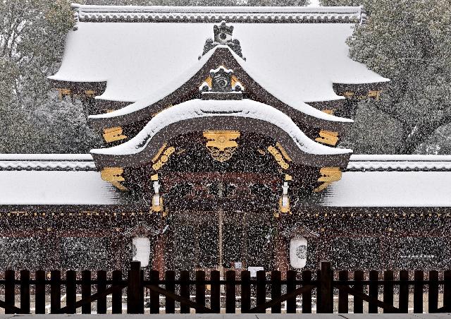 真正面から捉えた左右対称の構図で、屋根に積もった雪の「白」、建物の「濃い茶色」、そして錺金具(かざりかなぐ)の「金」のコントラストが非常に美しいです。雪景色によって余計な色が排除され、神聖な建物の装飾の美しさがより強調されています。降りしきる雪の描写が、まるで日本画のような情緒を醸し出しています。