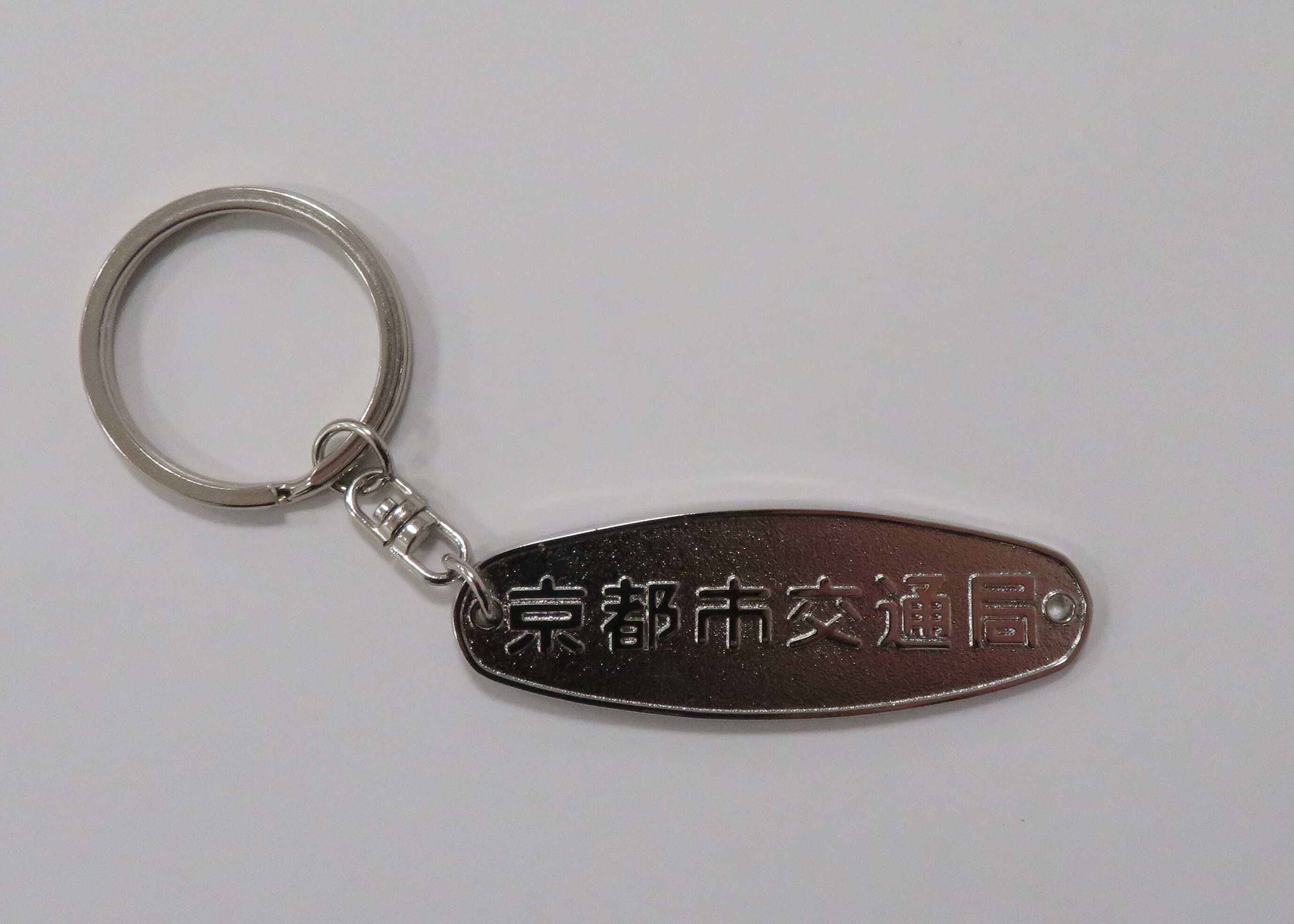 地下鉄烏丸線20系車両の内装に使用されている「標記銘板」をモチーフにしたキーホルダーです。車号銘板と事業者銘板を、各面にデザインしています。