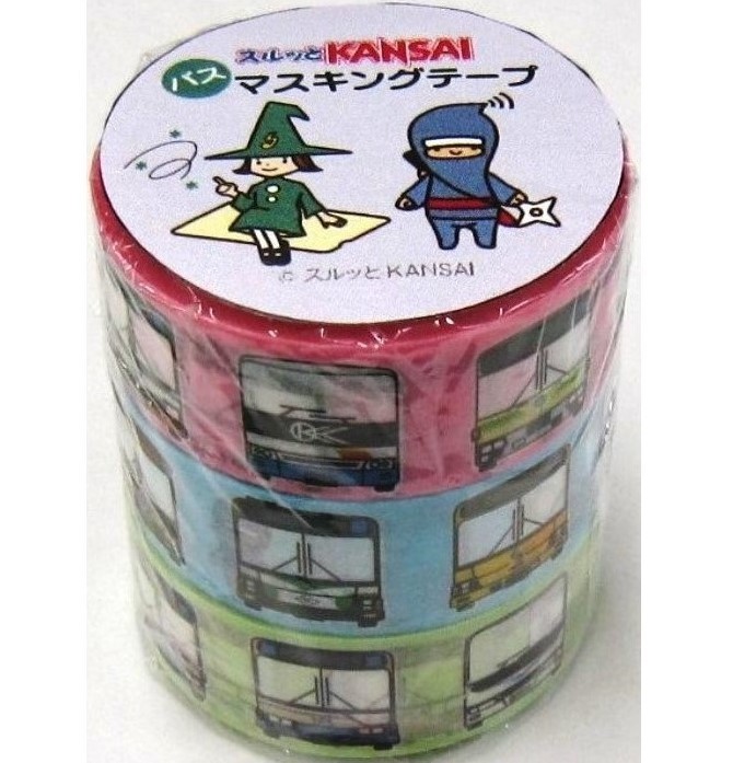 スルッとKANSAI協議会加盟バス社局の車両がデザインされた、3本セットのマスキングテープです。