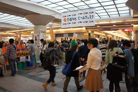 若手職員増客チーム1班(出会いのコンサルタント班)・市内地ビール醸造会社4社・市外地ビール醸造会社2社・地ビール販売酒店・ゼスト御池飲食店が参加し,駅ナカ・駅チカを盛り上げ,地下鉄の増客・増収に向けて,ゼスト御池河原町広場・市役所前広場において地ビールなどを販売します。
