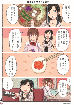 太秦萌と姉の麗が,それぞれの帰り道に待ち合わせして,鴨川沿いを息抜きに歩く姿を描いています。息苦しさを紛らわすロケーションで,身近な家族と肩の力を抜いて散歩するシチュエーションは,忙しすぎるとなかなかできなかったことかも。。という会話しているであろう様子を描きました。