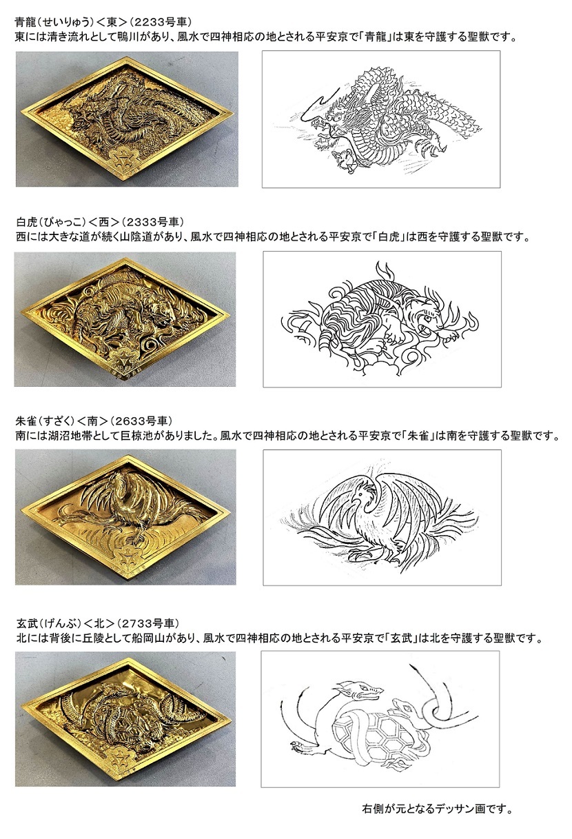 3編成目のデザインは「京の方位(四神)」をテーマにしました。四神(ししん・しじん)とは中国の神話で天の四方の方角を司る聖獣であり、東の青龍(せいりゅう)、西の白虎(びゃっこ)、南の朱雀(すざく)、北の玄武(げんぶ)を指します。平安京は四神が守護する「四神相応の地」として造られたとされています。四神相応とは風水において好適地とされる地勢や地相のことで、古来よりこの条件を満たす土地に住むと長く繁栄すると考えられてきました。