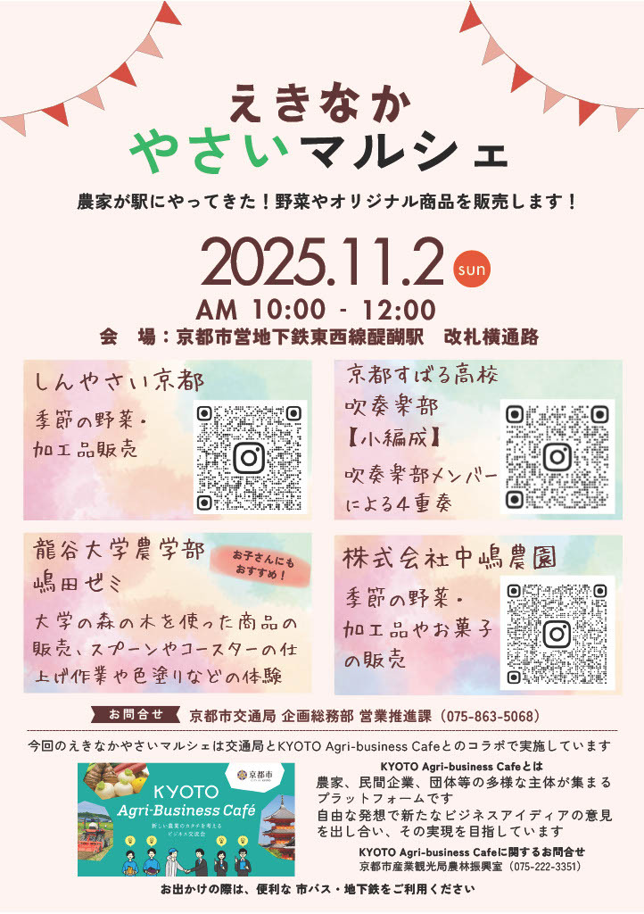 地下鉄駅での新たな賑わい創出と、「meetus(ミータス)山科-醍醐」の推進に資する取組として、令和7年9月から12月の毎月第1日曜日に、地下鉄醍醐駅にて「駅ナカ野菜マルシェ」を開催します。