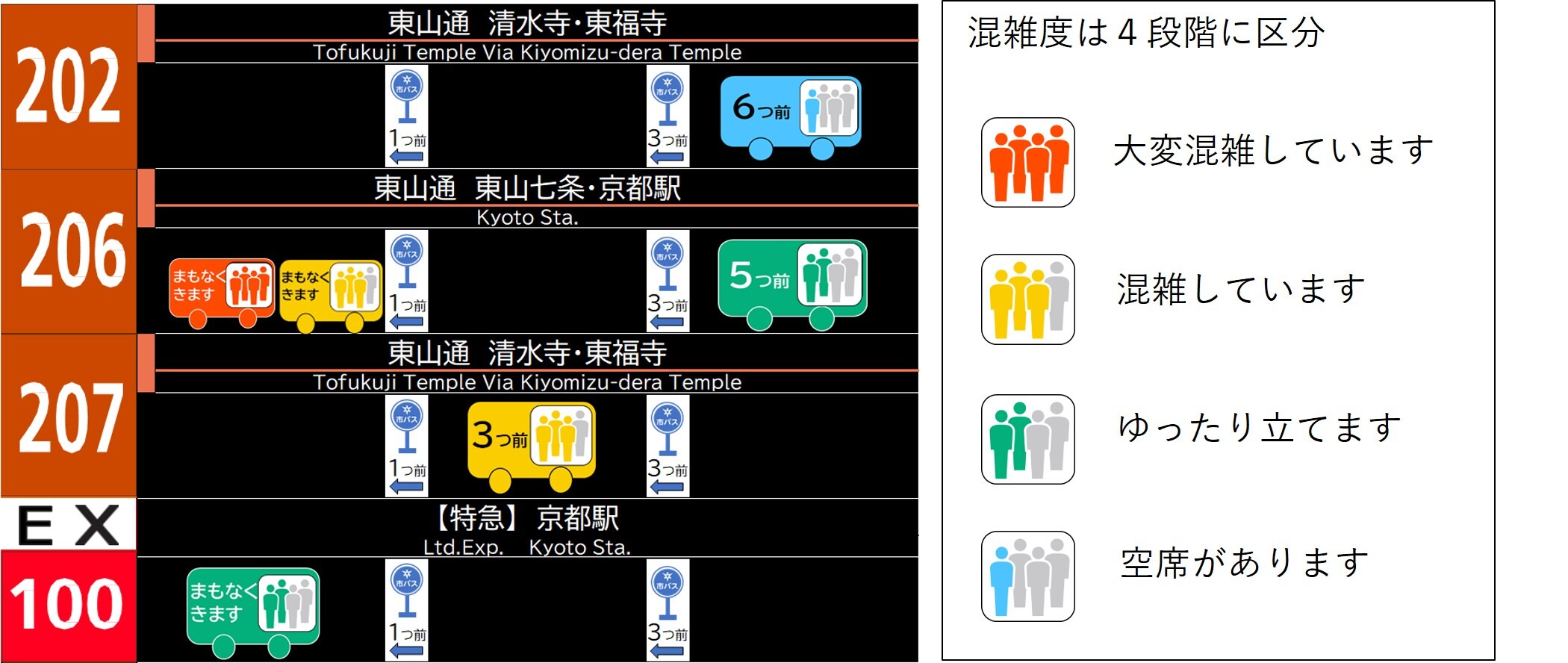 これにより、お客様にスマートフォン等で市バスの車内混雑度を御確認いただけるようになり、空いているバスや他のルートを選択いただくことで、御利用の分散を図ります。