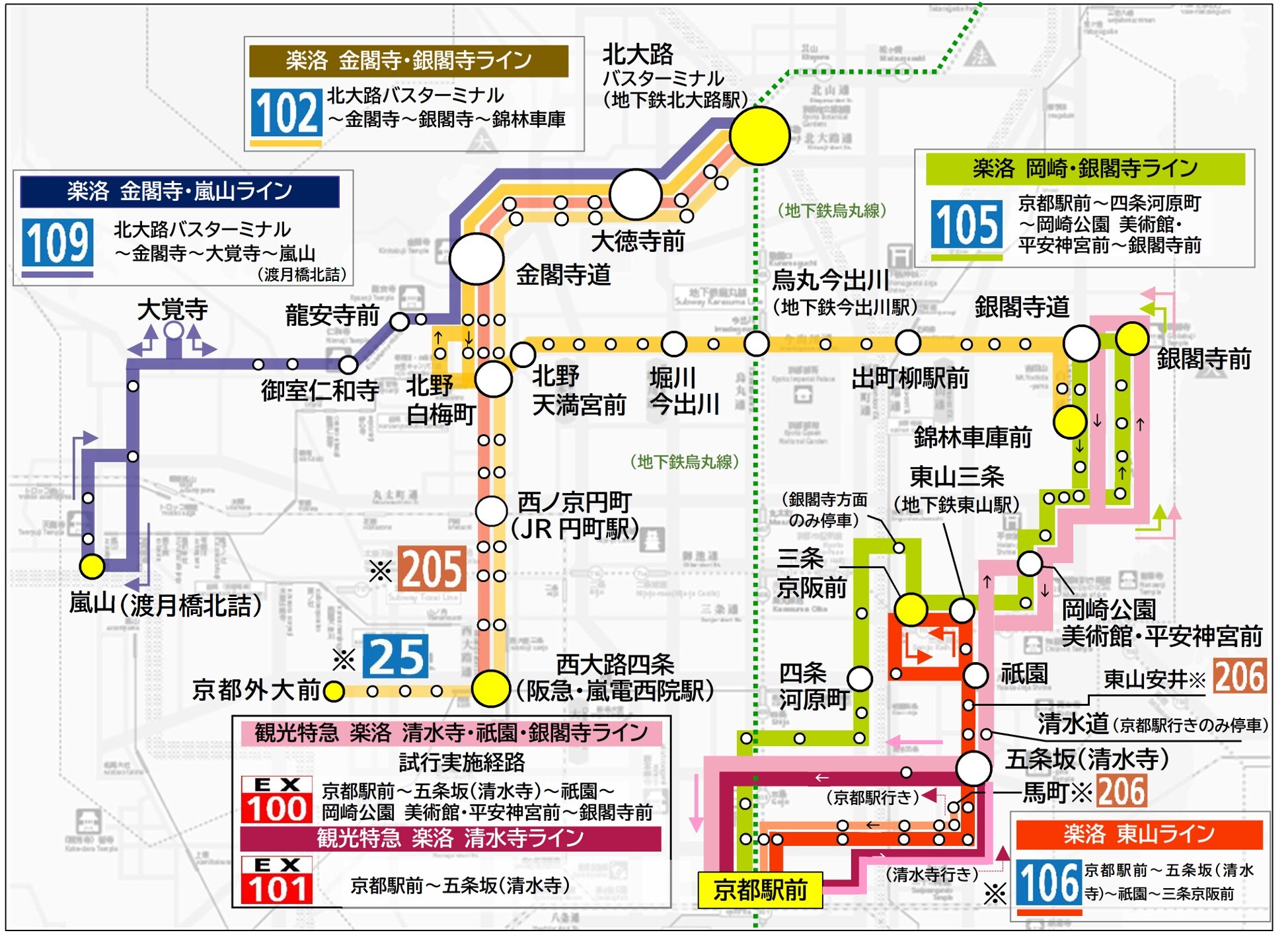 鉄道とバスを組み合わせた移動への誘導を図るため、鉄道駅と金閣寺を結ぶ25号系統、205号系統(区間運行便)を臨時増発します。