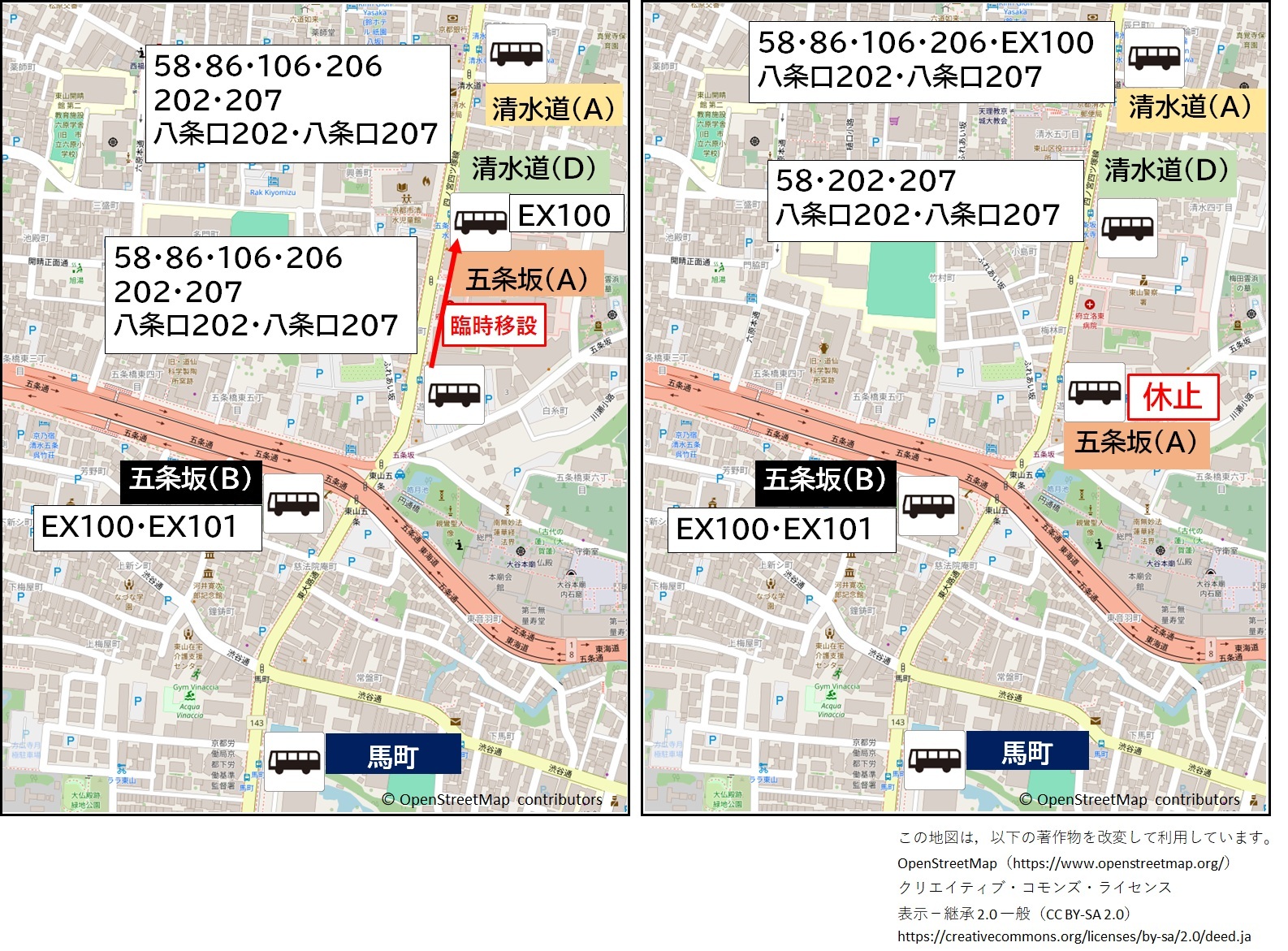 清水道・五条坂に設置している3か所の停留所の運用を見直し、行先・方面別に分けることで、分かりやすさの向上や停留所付近の混雑緩和と、お客様の利便性向上を図ります。