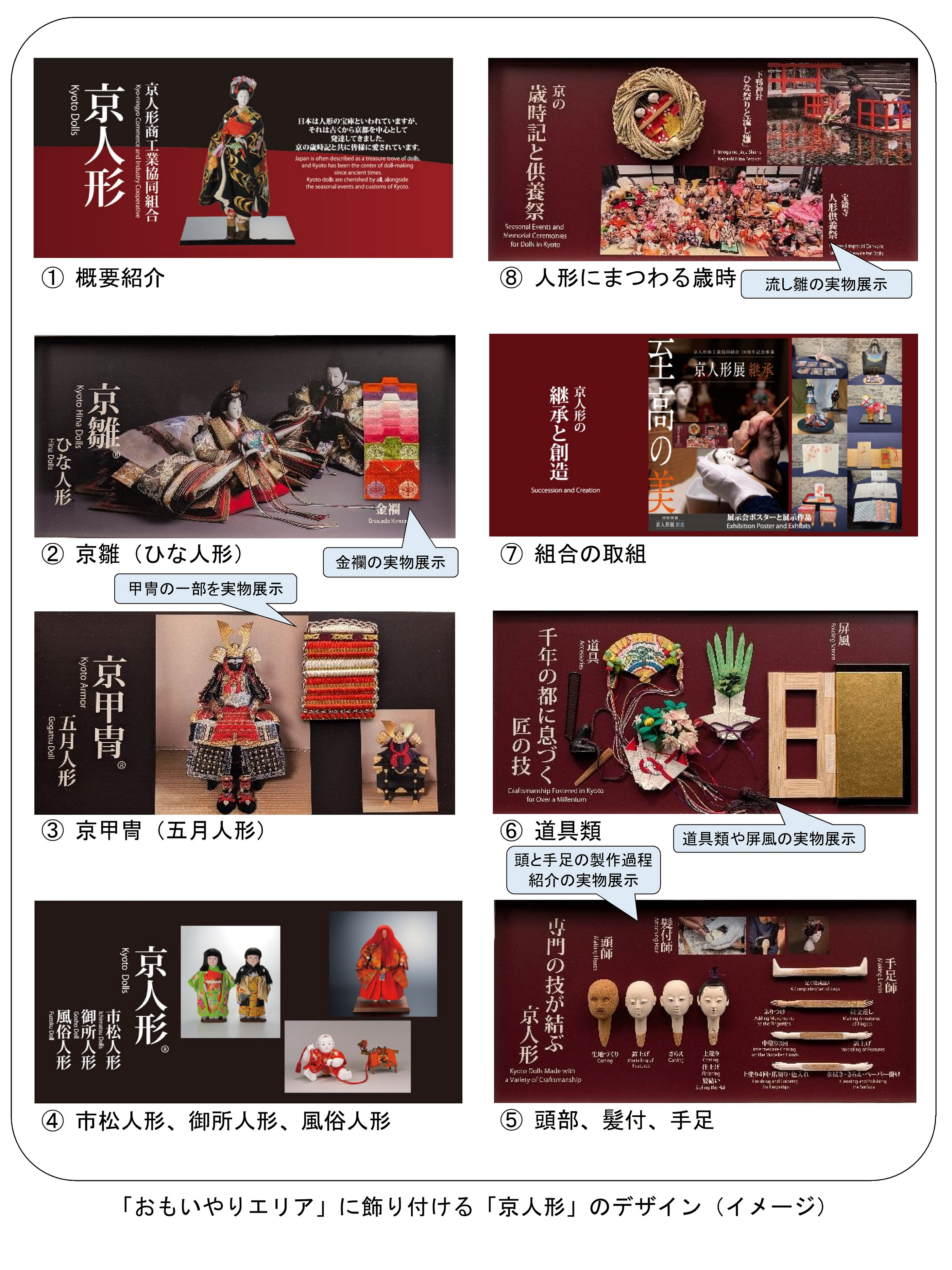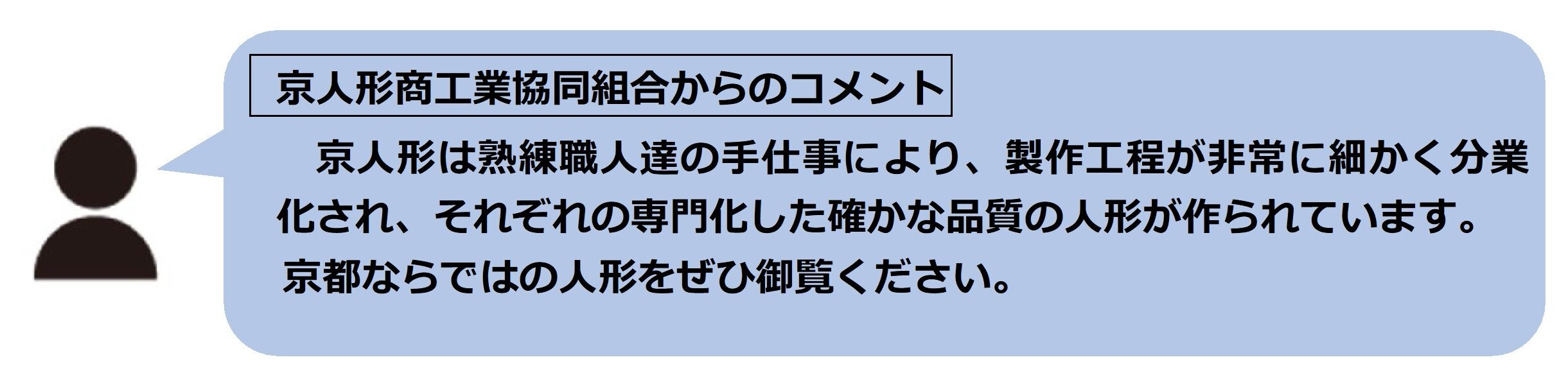 「おもいやりエリア」では、雛人形に使われる金襴、甲冑の一部、頭と手足の製作過程紹介、道具類や屏風、下鴨神社で行われる流し雛を実物展示し、「京人形」の魅力を紹介します。