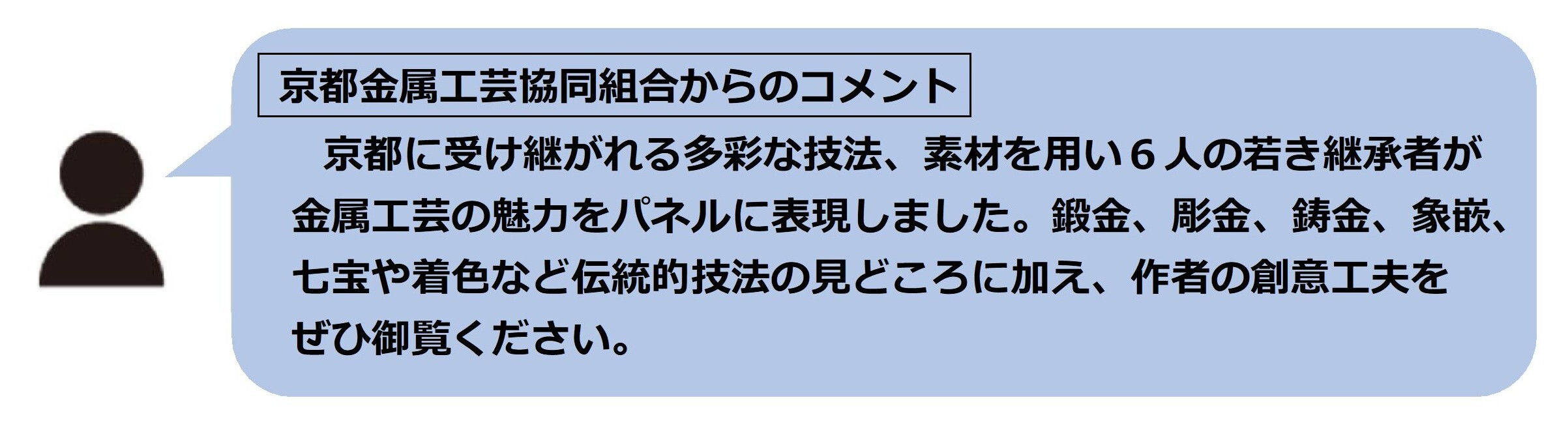 「おもいやりエリア」では、6人の若手職人によって「金属で遊ぶ」をテーマにし、それぞれの技法や素材を用いたオリジナル作品を制作しました。これらの「京都の金属工芸品」の魅力を紹介します。