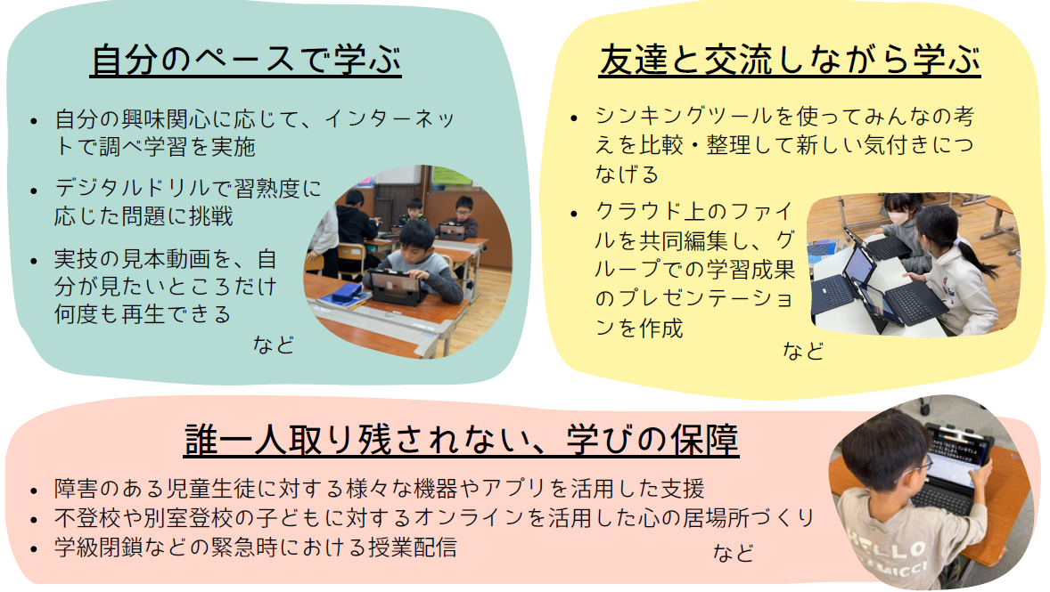 従来の教育実践にICTを効果的に組み合わせて、「個別最適な学び」と「協働的な学び」を一体的に充実させることで、「主体的・対話的で深い学び」の視点からの授業改善を進めるとともに、学習活動の一層の充実を図っています。