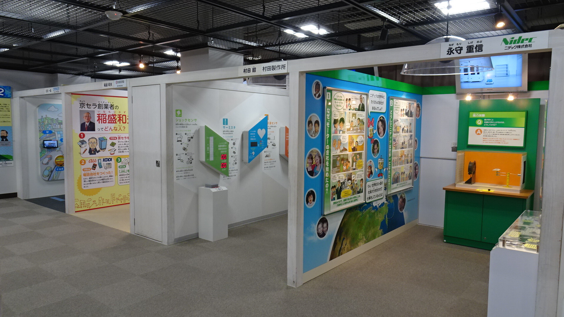 先端技術産業を中心に「ものづくり都市・京都」を支える京都の企業創業者・科学者等の創業や研究の動機・あゆみ、日常生活と密接につながる技術・製品等を紹介する17企業16のブースを設置しています。各ブースでは、パネルや映像コンテンツの上映、製品見本の設置、クイズ形式による学習等、工夫を凝らした展示を展開しています。