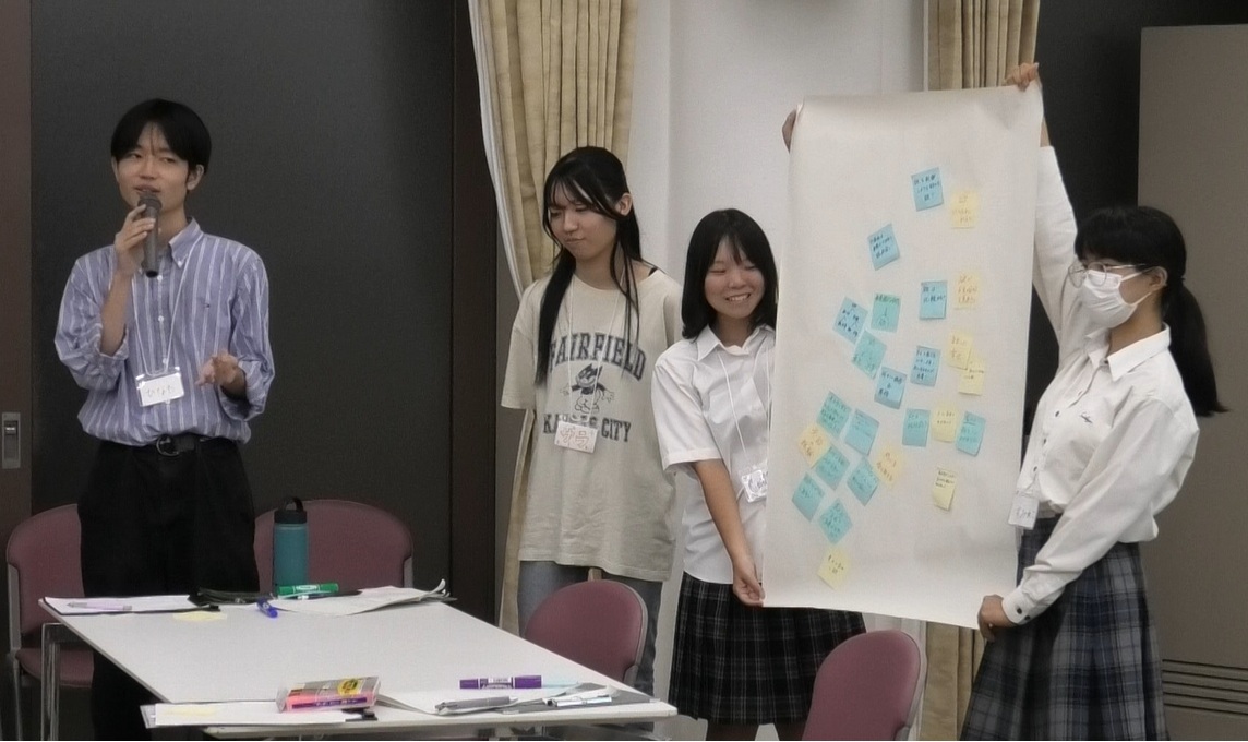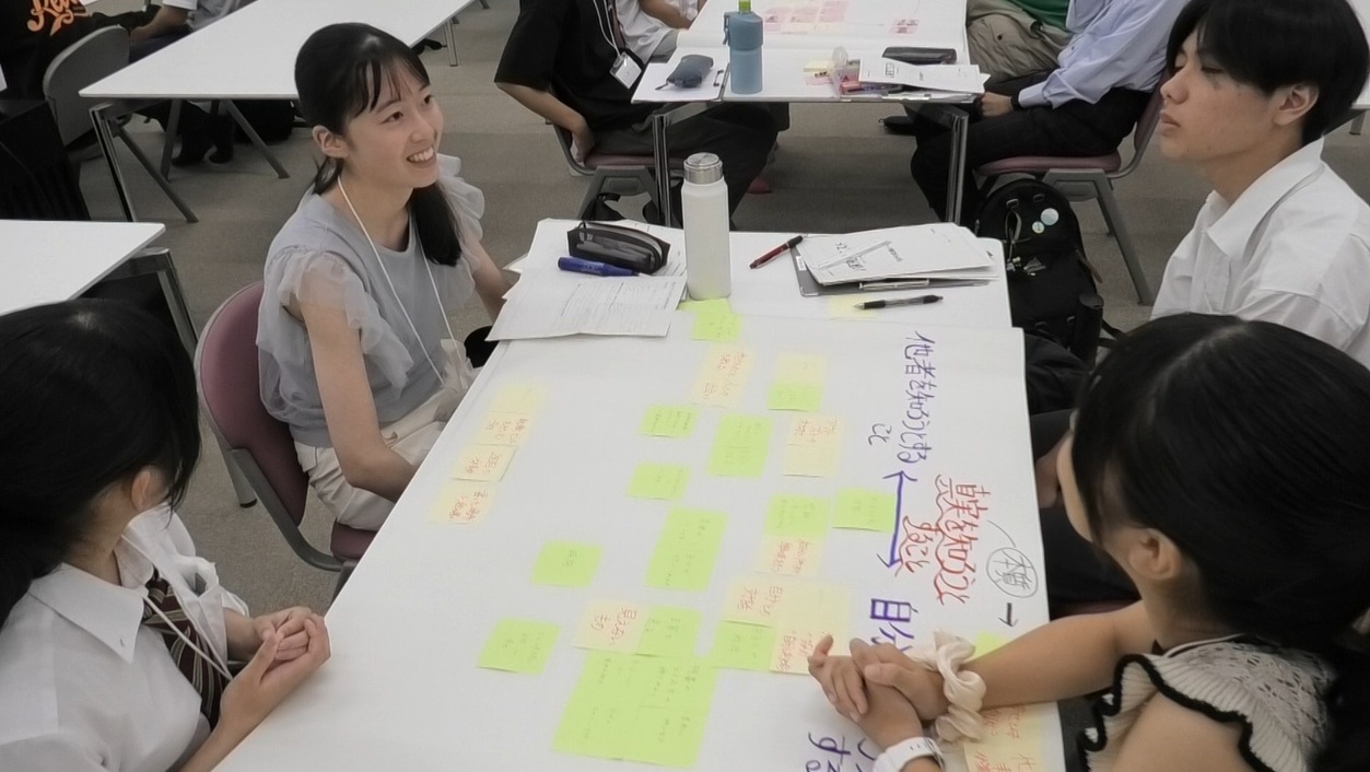 午後の部では、Day1での北部・南部コースでの体験や午前中の学びをふまえて、他校・他学年の生徒たちと交流しました。少人数のグループで意見を出し合い、共通して大切だと感じたことを言葉にまとめて発表しました。初めは緊張していた生徒も、次第に発言が活発になり、「異なる人生観や価値観に触れ、自分にない考え方に出会えた」という感想も寄せられ、交流が学びを大きく広げている様子が見られました。